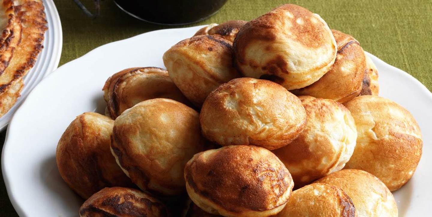 4. Æbleskiverne bages i palmin eller andet fedtstof i en god varm æbleskivepande. Hullerne fyldes ca. ⅔ op med æbleskivedej, og når de er bagt på den ene side, vendes de med en gaffel eller strikkepind, og bages færdig.